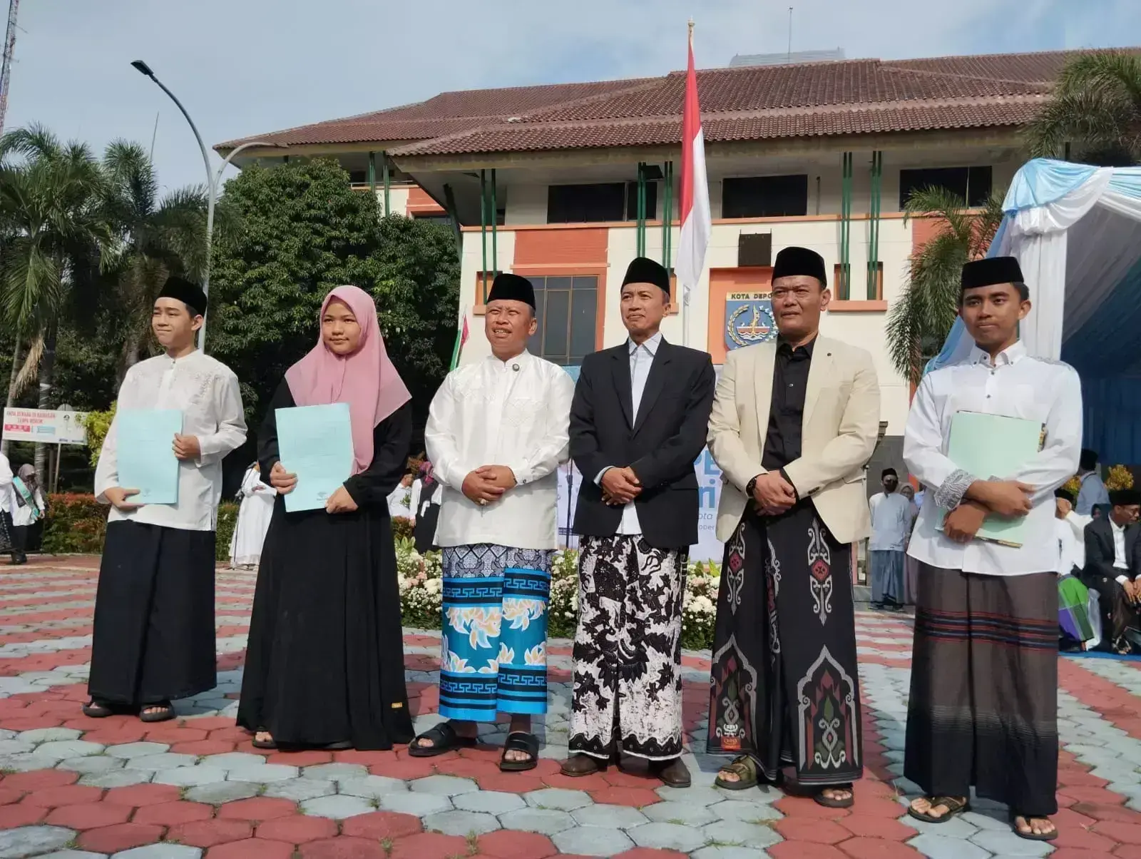 Depok, inforakyatindonesia.com – Wali Kota Depok, Supian Suri bersama Kepala Kantor Kementerian Agama (Kemenag) Kota Depok, Enjat Mujiat dan Ketua Pengrus Cabang Nahdlatul Ulama (PCNU) Kota Depok, Achmad Solechan menyerahkan penghargaan kepada santri berprestasi dan santunan kepada santri yatim.